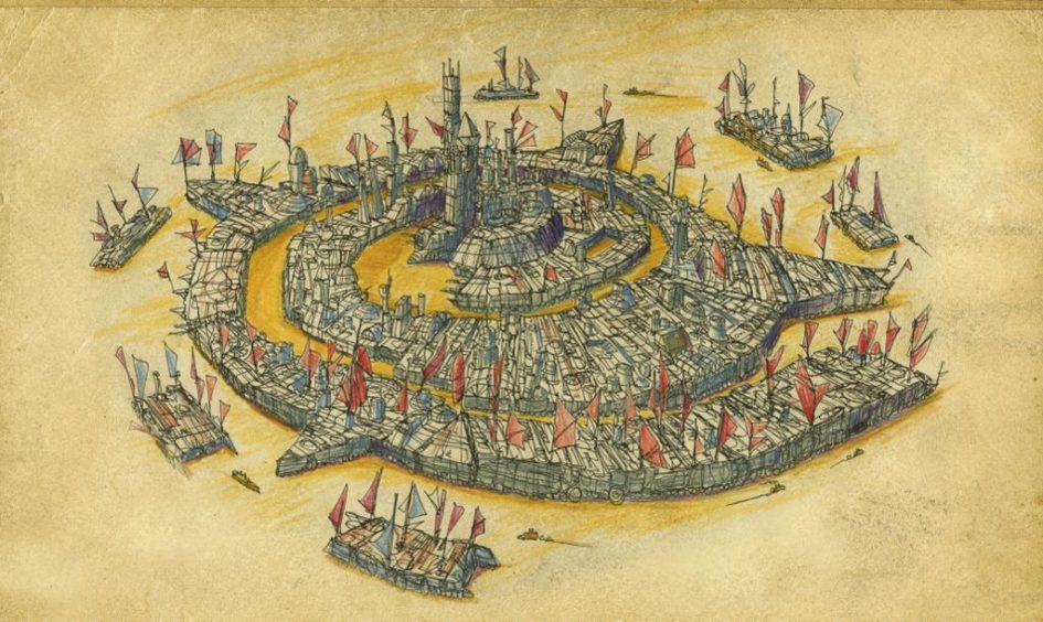 Ognuno di questi quartieri-satellite inalberava un complicato sistema di vele che lo faceva muovere in tondo attorno alla città, come una sentinella in ronda. Ed era un’enclave a sé stante, con tanto di faro notturno, banchine d’attracco, cantiere di riparazione, magazzini ricambi e di stoccaggio, vetreria, mercato del pesce, gru e paranchi per il carico e lo scarico delle merci. In previsione delle tempeste di sabbia più violente gli isolotti ammainavano la velatura e venivano ancorati al nucleo principale di Mecharatt da titaniche catene, in modo che la furia del vento non li strappasse dalla loro orbita spingendoli alla deriva nel deserto.