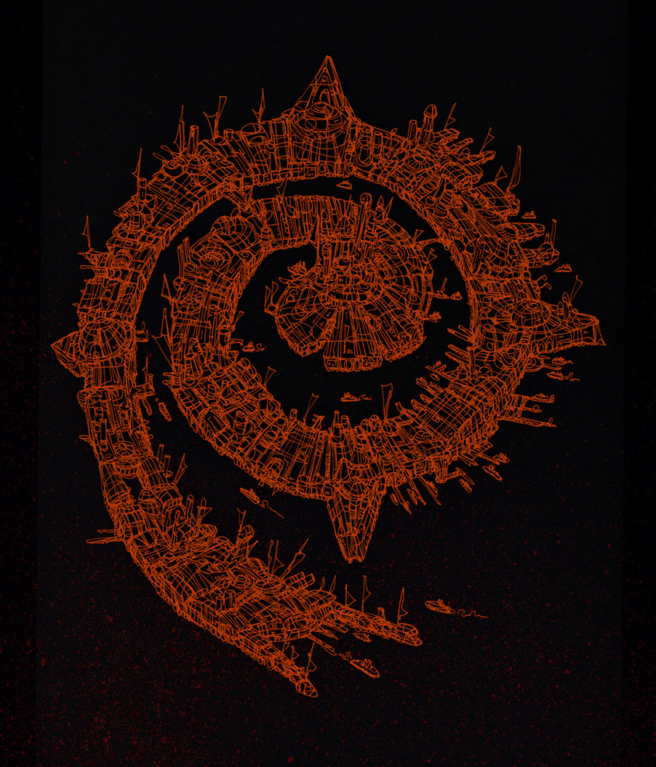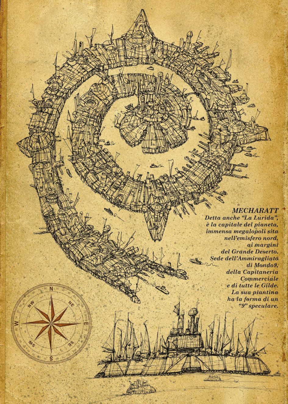 Che fare quindi? Da dove cominciare a mappare un mondo che è solo nella testa del suo autore e che come unità di misura usa soltanto parole, frasi e pagine? Ma certo: dai cosiddetti “punti d’interesse”, secondo la terminologia dei navigatori satellitari di oggi. E quale “punto d’interesse” potrebbe essere più… interessante di Mecharatt “La Lurida”, l’immensa megalopoli ai margini del deserto, la più estesa e popolosa di tutto Mondo9, crogiolo di genti e colori, dove tutto scotta, abbaglia ed emana fumo nero? Tra metallo rovente, concrezioni di ruggine, altiforni, rotaie, vapore e fuliggine. Uno skyline di torri, ciminiere, gru, fari e minareti…