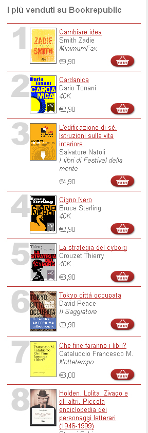 Da oltre un mese “Cardanica” compare nella “top ten” degli e-book più scaricati da BookRepublic: era terzo nella settimana del 6-12 settembre, si è attestato al secondo posto in quelle del 13-19/9 e del 20-26/9, per passare all’ottavo dal 28 settembre dal 3 ottobre e risalire al quinto dal 4 all’11 ottobre.
