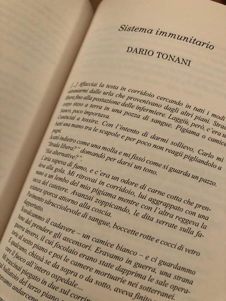 “[…] Affacciai la testa in corridoio cercando in tutti i modi di estraniarmi dalle urla che provenivano dagli altri piani. Strada libera fino alla postazione delle infermiere. Laggiù, però, c’era un corpo steso a terra in una pozza di sangue. Pigiama o camice bianco poco importava.