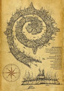 Immaginate una Venezia forgiata nel metallo e irraggiata da un sole implacabile dall’alba al tramonto, con i canali che serpeggiano nella sabbia anziché nell’acqua di laguna. Immaginate i titani a ruote che s’incuneano fra le dimore senzienti dei quartieri mechardionici, le urla dei venditori e le imprecazioni dei portuali proferite in lingue sconosciute, il fetore di sporcizia, il sudore, i versi di animali mai visti, gli aromi di terre lontanissime, i rumori di un porto in costante attività…