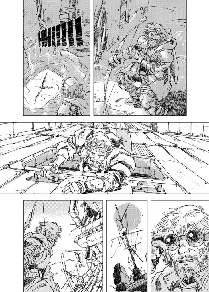 Sargàn si sedette su una pietra e si guardò attorno; in bilico su un costone di roccia, il relitto era una cattedrale di ruggine coricata sul fianco di dritta, coperto dai licheni e trapuntato da colonie di funghi violacei. A causa della pendenza, molte delle ruote erano rotolate lontano o precipitate a valle; quelle superstiti spuntavano qua e là dall’erba con il contorno di mozziconi d’albero e spezzoni di paratie.