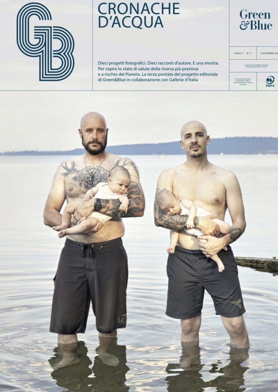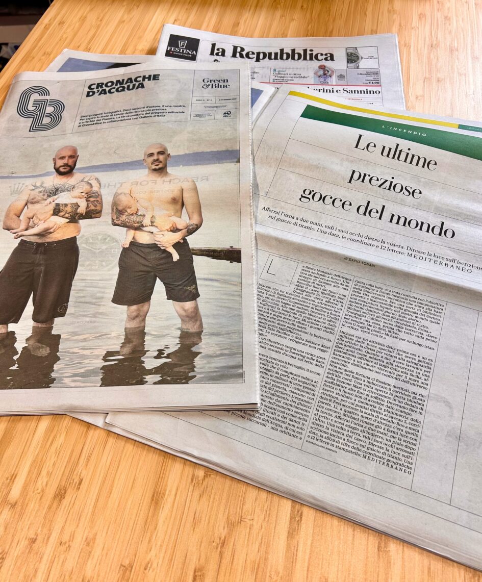 Il 3 dicembre, allegato a “la Repubblica” e “La Stampa” è uscito in edicola un numero unico e imperdibile del magazine “Green&Blue”, in cui sette fotografi e dieci scrittori raccontano l’acqua in tutte le sue forme, in un itinerario d’autore tra immagini e narrazione. Parole e fotografie ritraggono torrenti e fiumi, cascate e ghiacciai, laghi e barche per attraversarli da sponda a sponda, ma anche il cambiamento climatico e la resilienza di chi vive dovendo dipendere dai corsi d’acqua del territorio.