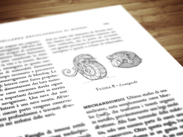 «Riportiamo alcune voci particolarmente significative dal trattato che l’esploratore e Gran Maestro della Gilda dei Cartografi, Hieronymus Frank Eisenach, scrisse a cavallo di quasi trent’anni di viaggi, attraverso Mondo9. Oltre un secolo fa, egli viaggiò lungo il cosiddetto “guscio” del pianeta, dall’equatore ai poli, dalle foreste pluviali dell’emisfero australe agli sconfinati deserti della “Fascia rovente” compresa tra il 40° parallelo Nord e il 40° Sud, imbarcato su una dozzina di navi molto diverse fra loro; cargo portauova, baleniere, schooner, corvette, incrociatori da battaglia. Il suo Compendio illustrato ha destato per decenni meraviglia sui banchi di scuole, accademie navali e cantieri. E almeno quattro Gilde (Astronomi, Avvelenatori, Botanici e Meteorologi) lo hanno adottato come testo propedeutico di base per avviare i giovani apprendisti alla professione. Nella sede dell’Ammiragliato Centrale di Mecharatt è custodita, protetta in una teca di vetro secco blindato, la prima copia autografa, che riporta ancora le note a margine vergate a mano dall’autore e i suoi raffinati disegni originari. Durante la cerimonia di assegnazione al comando di un’unità navale, assieme ai gradi, al sestante e al cannocchiale di prammatica, il neocapitano ne riceve una copia (di solito l’edizione tascabile), come viatico benaugurante.»