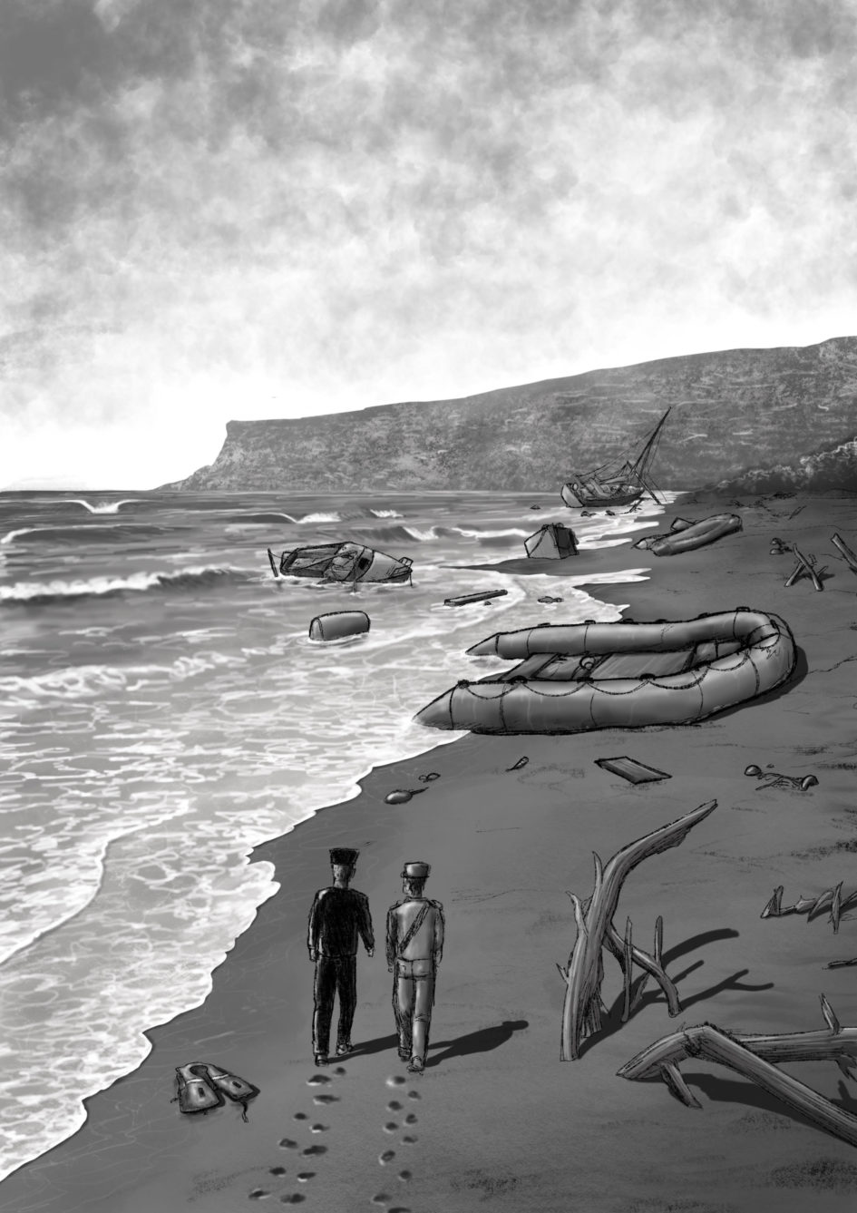 La struggente storia “Chiodi”, che compare sul n. 91 di Robot (Delos Books), nasce in mare, a bordo di un gommone stipato di disperati in cerca di una speranza. Uno scafista cinico e violento, una frotta di uomini impauriti e, tra loro, un’unica donna; una giovane madre che allatta al seno il suo bimbo nato da pochi giorni. E poi qualcosa che affiora dal pelo dell’acqua in un ribollire di schiuma…